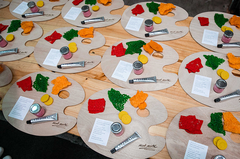 Inspired by a painters palette, I looked at collecting everything an artist would use to decorate a crazy colourful scene with, from the painters palette that we dined off to paint tins of cocktails sipped on arrival, from delicious dips being squeezed from paint tubes to a self serve rainbow salad bar that shone so brightly it really became a delicious focal point.
